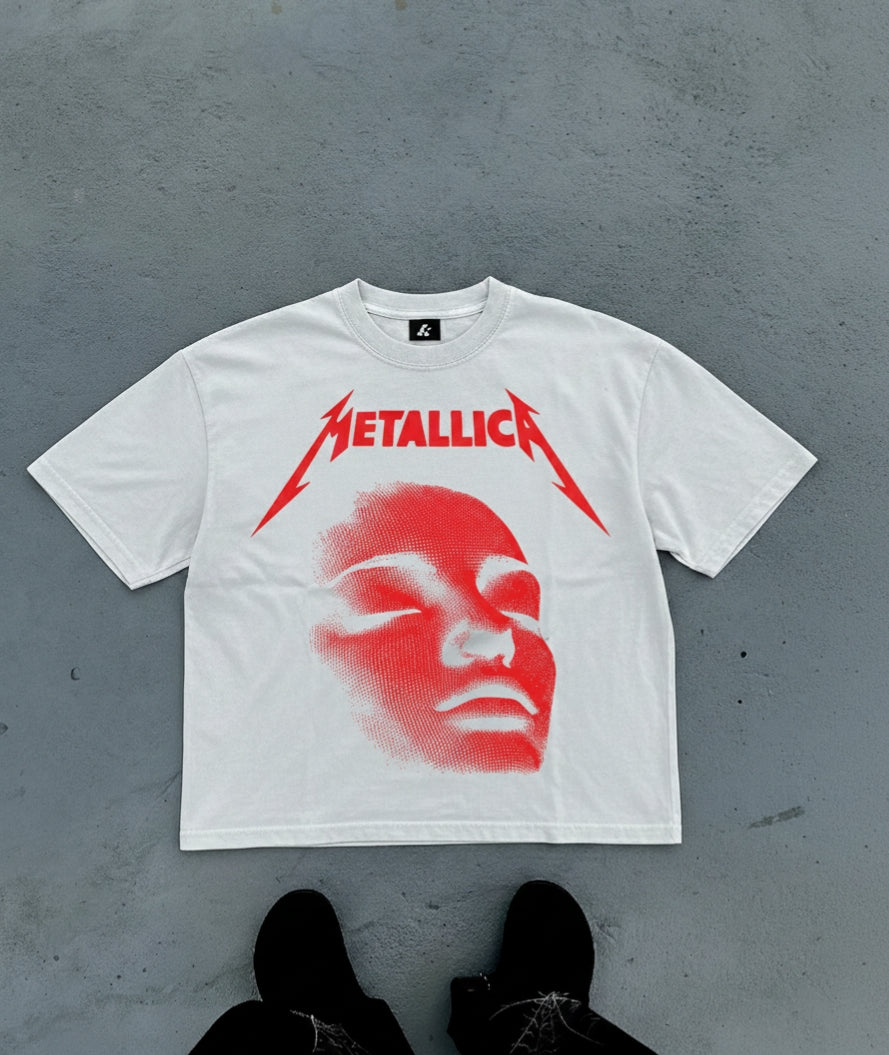 Minimal words. Clear impact. This tee is not loud β itβs aggressive in silence. A bold red halftone face print paired with sharp metal-inspired typography gives this t-shirt a raw, underground streetwear vibe.